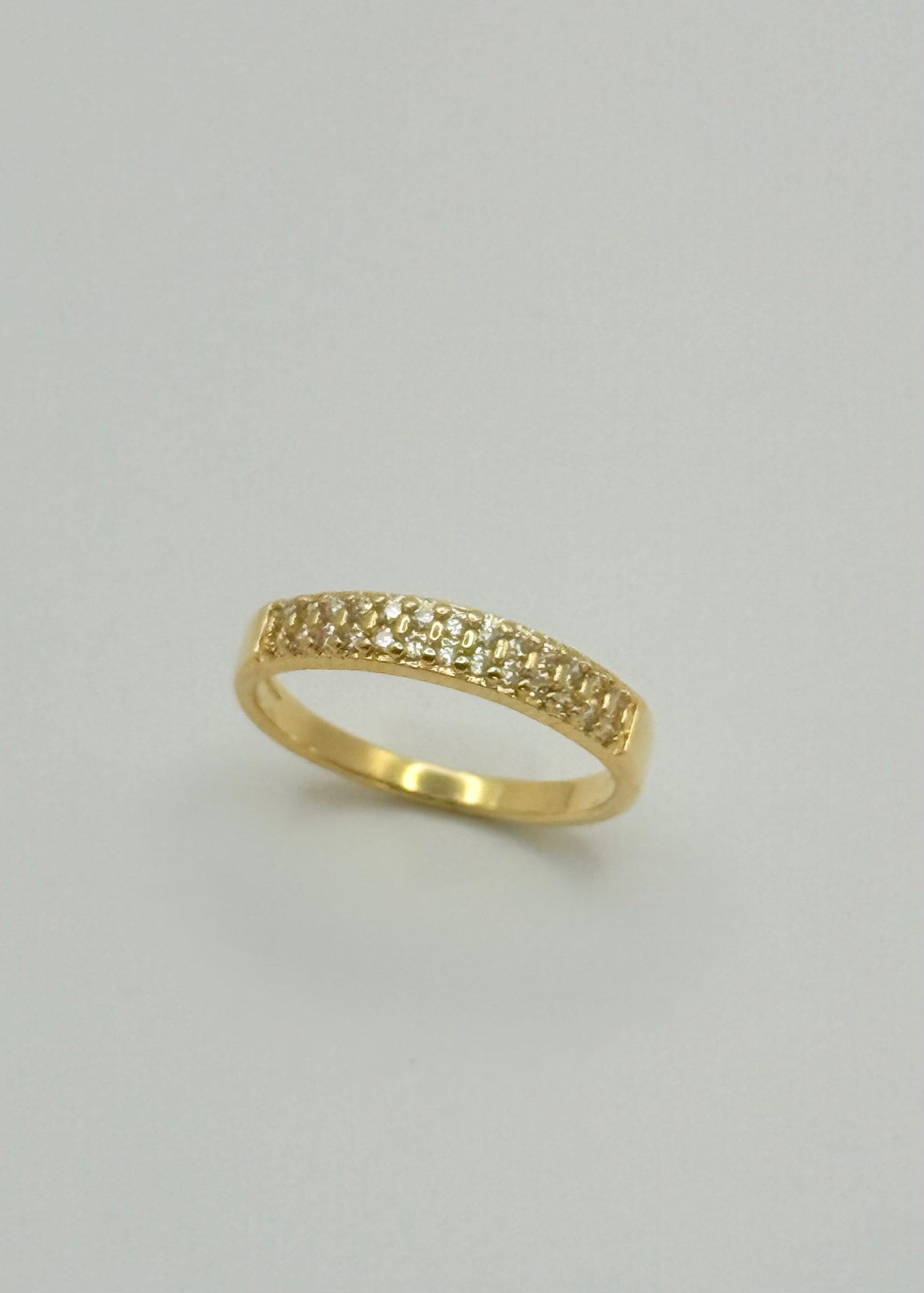 Anillo chapado en oro de 22 quilates con una base de materiales nobles e hipoalergénicos. Con dos líneas de circonitas.