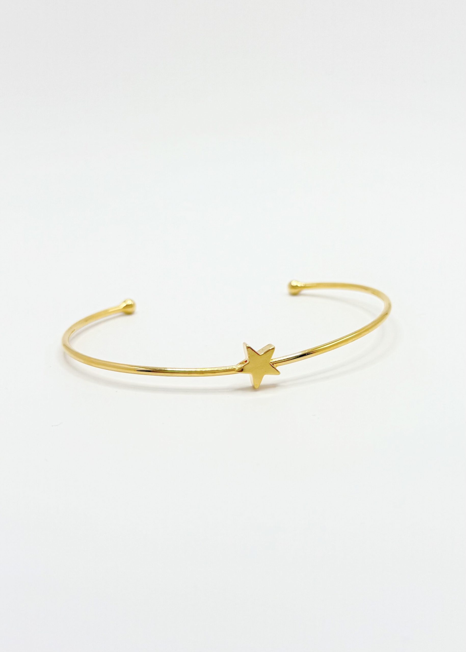Brazalete chapado en oro de 22 quilates con una base de materiales nobles e hipoalergénicos. El brazalete es rigido pero a la vez flexible para que sea facilmente adaptable, con una estrella en el centro que lo hace una pieza sencilla y delicada.