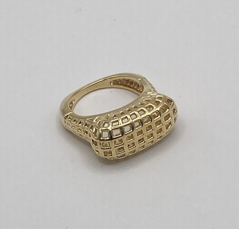 Anillo fabricado en aleación de latón de alta calidad, baño de oro de 18 quilates, hipoalergénico. Combina formas geométricas con un acabado impecable. Su estructura calada aporta ligereza y estilo, convirtiéndolo en una joya esencial para las amantes de la joyería contemporánea.