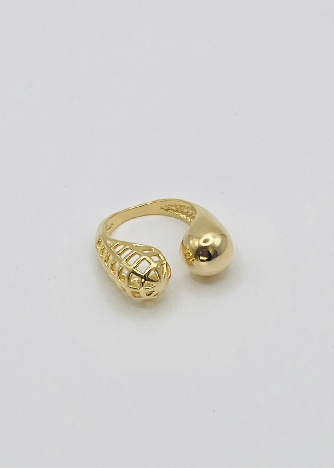 Anillo fabricado en aleación de latón de alta calidad, baño de oro de 18 quilates, hipoalergénico. Con líneas fluidas y detalles calados, aporta un toque artístico y moderno. Su diseño abierto y su distintiva estructura lo convierten en un accesorio sofisticado y versátil para cualquier ocasión.