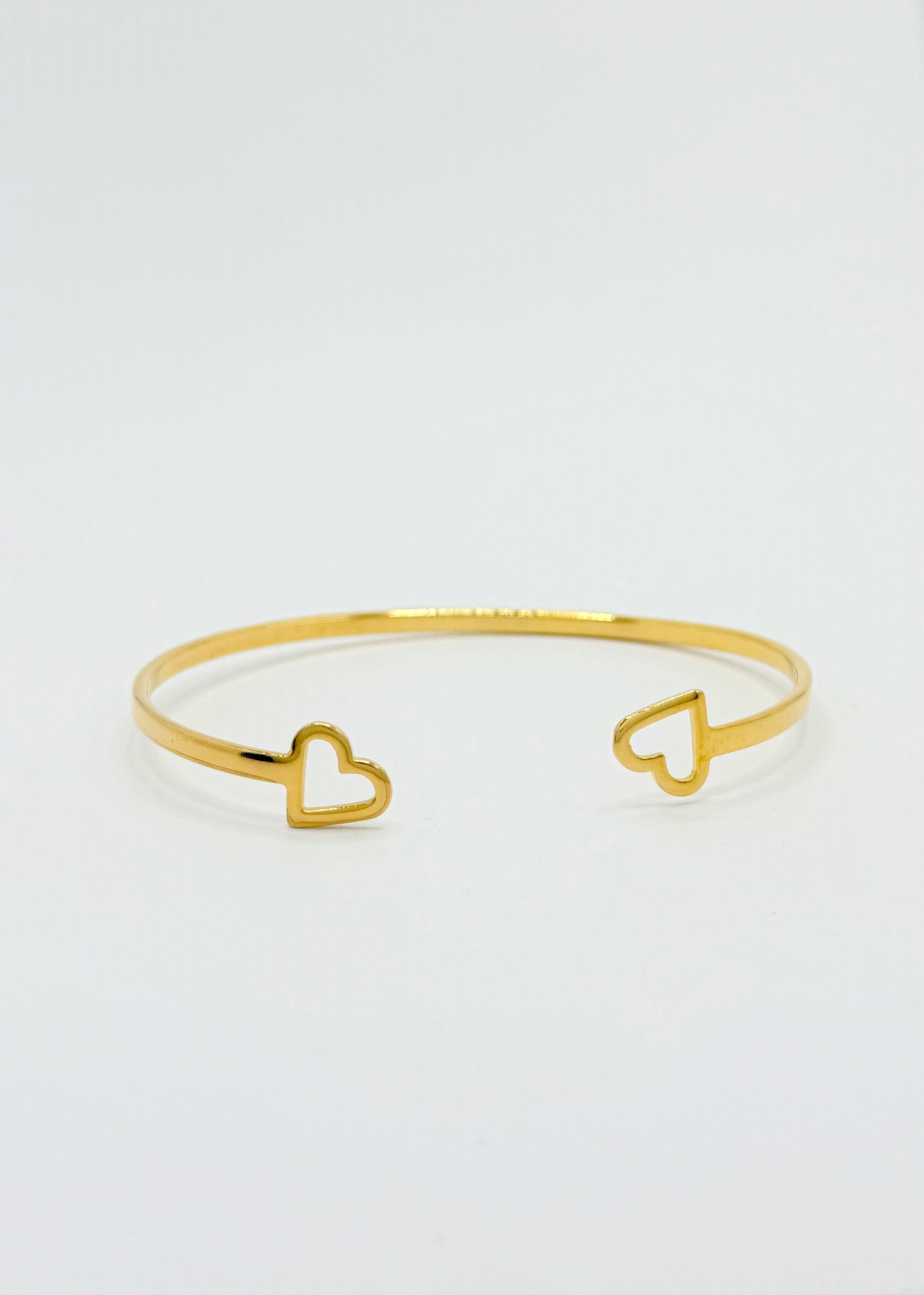 Brazalete chapado en oro de 22 quilates con una base de materiales nobles e hipoalergénicos. El brazalete es rigido pero a la vez flexible para que sea facilmente adaptable, con dos corazones en los extremos que lo hace una pieza única.