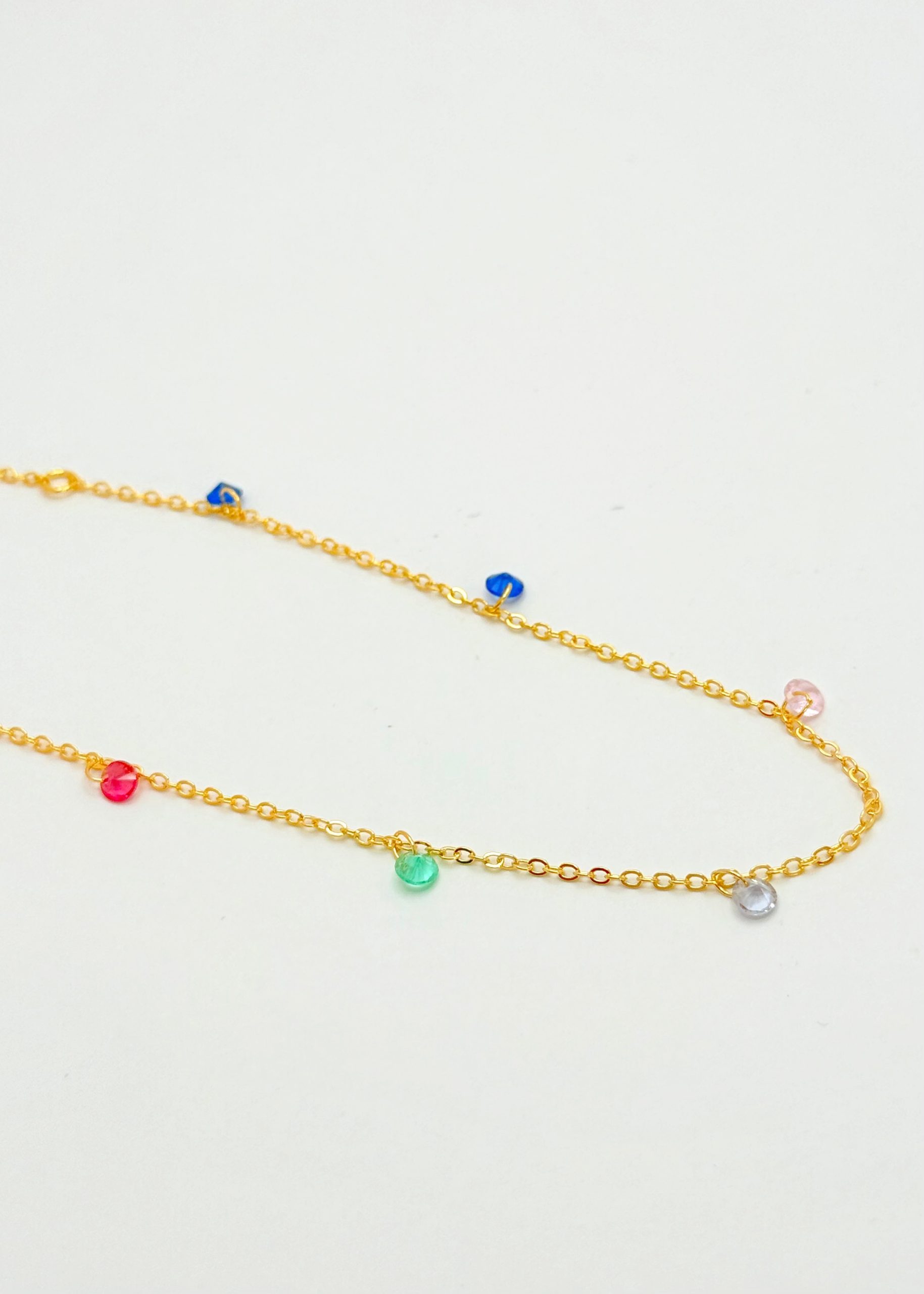Collar chapado en oro de 22 quilates con una base de materiales nobles e hipoalergénicos. Con pequeños detalles en vidrio de colores que lo hace alegre y perfecto para temporada de primavera-verano.