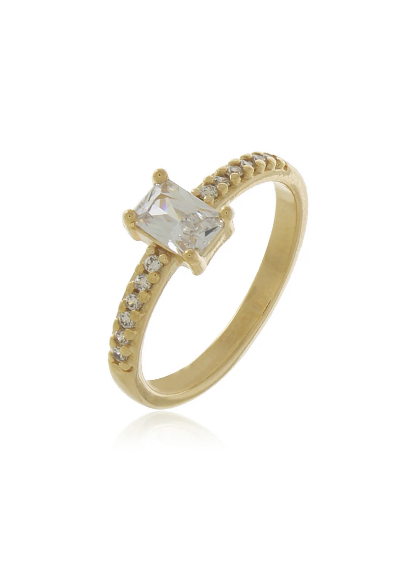 Anillo fabricado en aleación de latón de alta calidad, circonitas, baño de oro de 18 quilates, hipoalergénico. Este anillo solitario luce una impresionante circonita rectangular central y una banda con tachuelas que le otorgan brillo y sofisticación.
